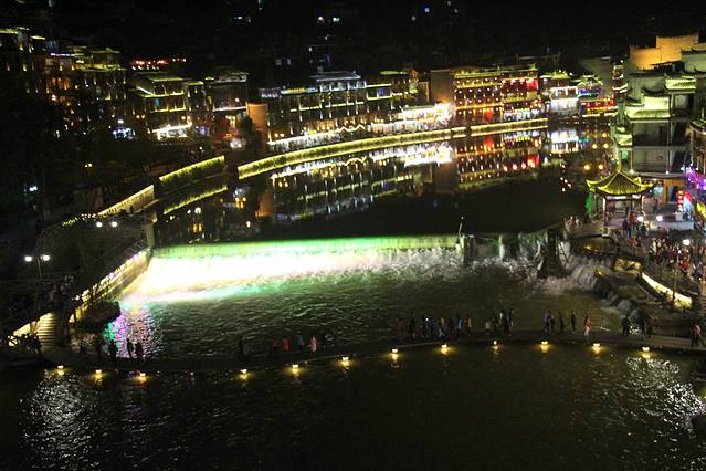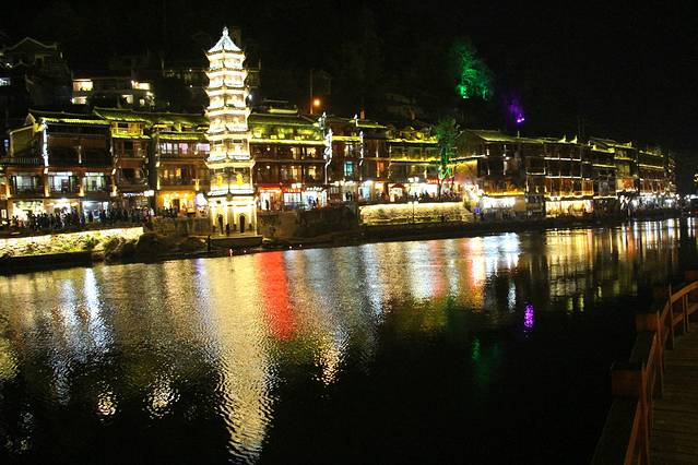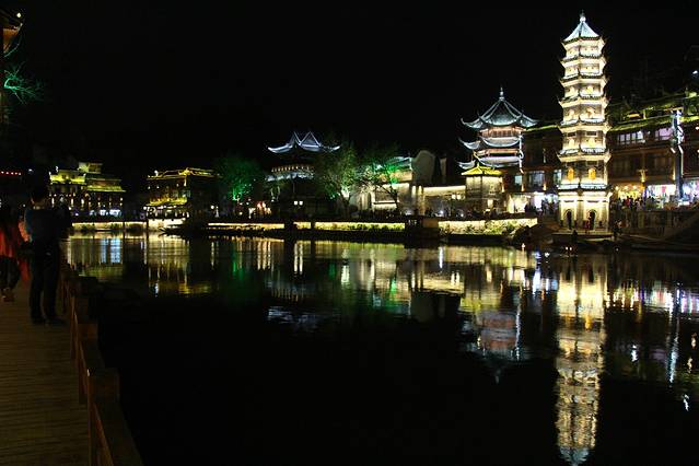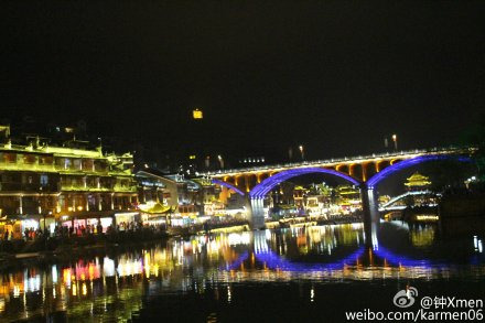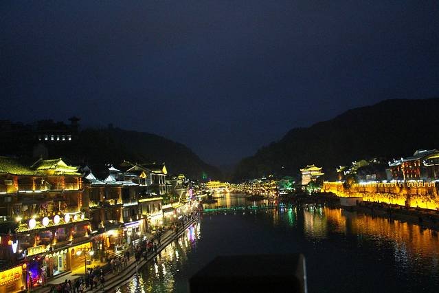 夜晚的凤凰,江两岸的灯光映照到江面上,特别迷人~
