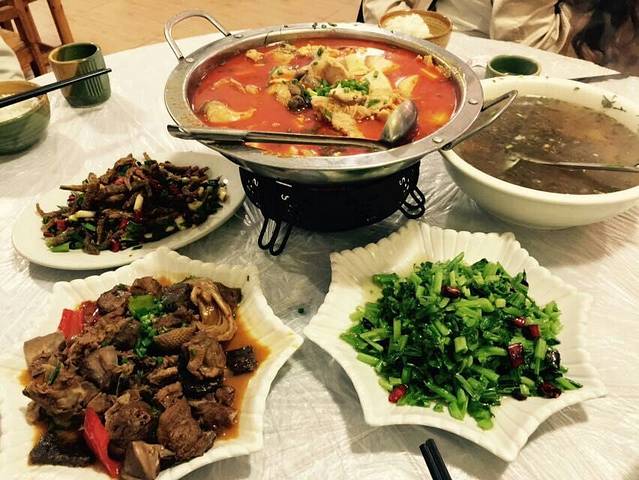 血粑鸭真的很特别超级好吃的,酸汤鱼(虽然我不是很能吃辣,但是面对这鱼真的忍不住,超级好吃的),沱江小鱼,一个青菜,一个汤.每人平均才二十多,是十分便宜的。
