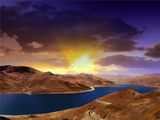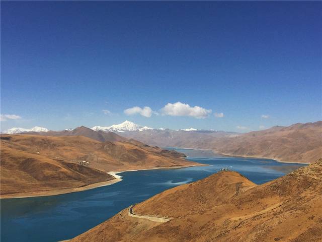 羊湖在藏人心目当中被看做是“神女散落的绿松石耳坠”,因为无论你在哪个角度,都不能看到羊卓的全貌。她的身躯蜿蜒在群山中达一百三十多公里,只有在地图或是高空你才能惊喜的发现她犹如耳坠,镶嵌在山的耳轮之上。