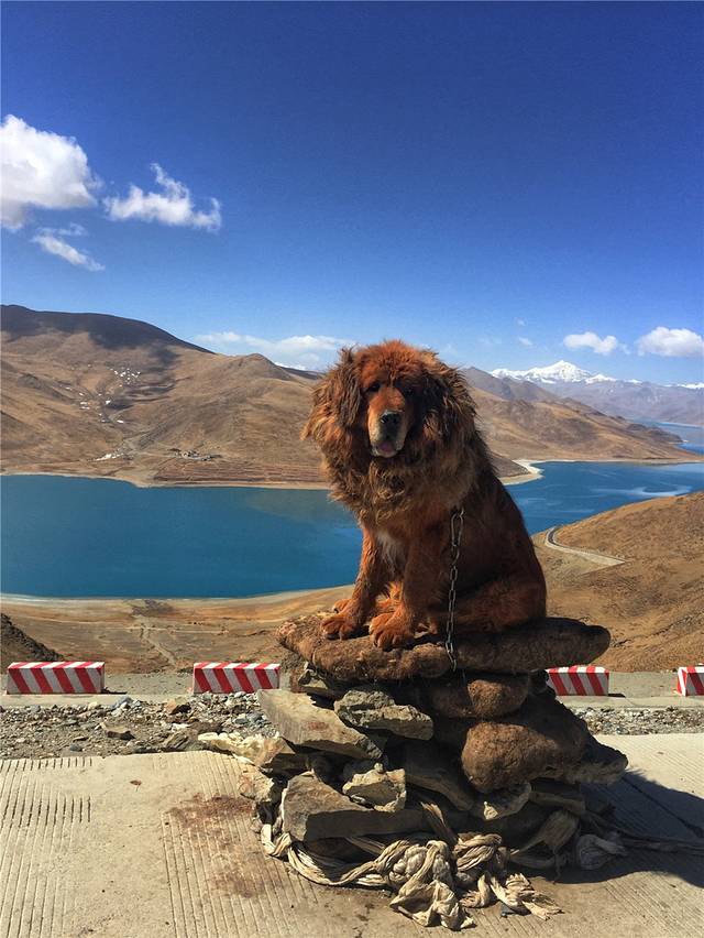 秀美羊湖旁长年有一只藏獒,但每年都是不同的狗狗,时而带着红围脖,10块钱随便合影。
