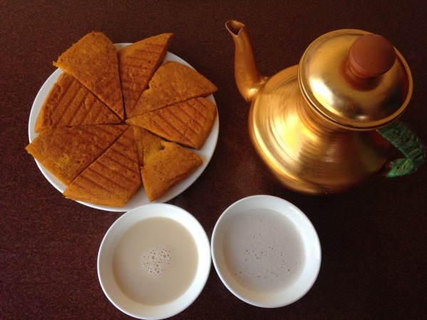 吃过早饭,店长说坐早班机来的尽量不要立马外出,否则高反会非常严重,建议先休息一会,午饭之后再出去,为了不影响旅行质量,果断听从她的建议。中午在钱同便民小吃青稞饼配酥油茶