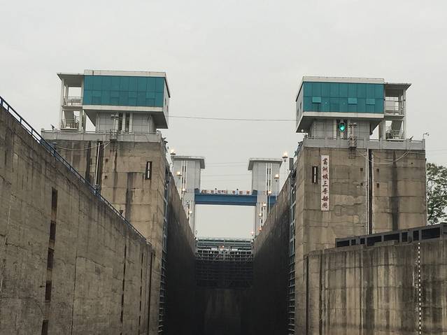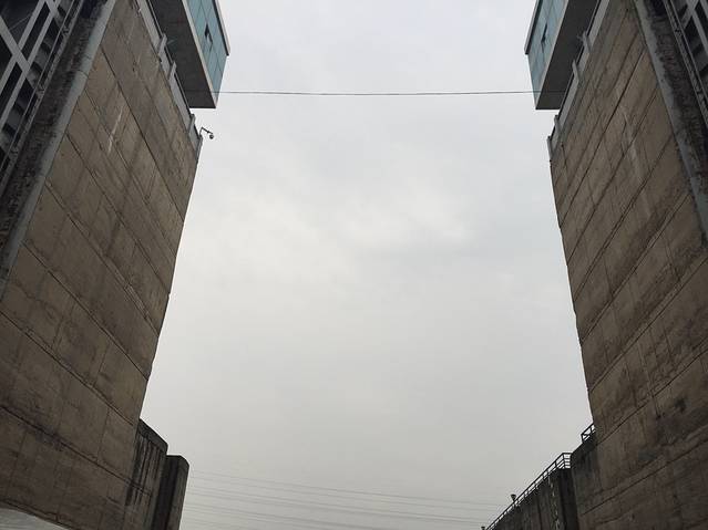 葛洲坝的关闸放水是很壮观的景象。因为地势原因,两边水位不一样,船只行到这里需要关闸门,放水,水涨船高,直至与高处水位相当,船才行出,待船行出后,恢复正常水位