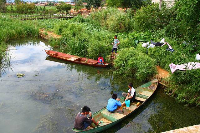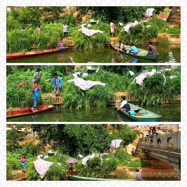 桥边的孩子们正在无忧无虑的玩耍,捕鱼,打水仗... 羡慕这些孩子,几条小船、一个鱼竿,就能呆上一整个个下午,清澈的湖水,还能倒影出他们的影子。