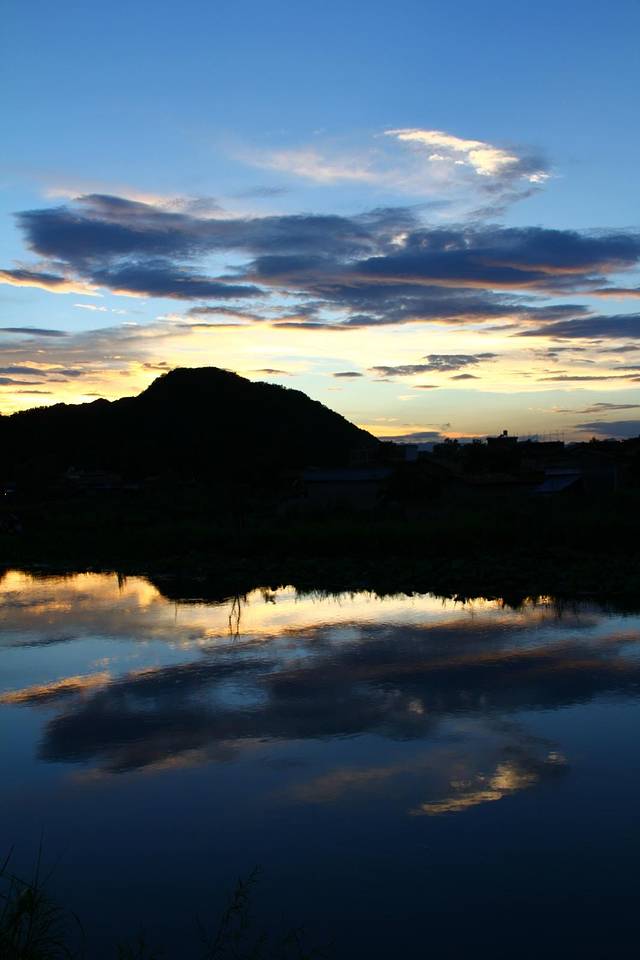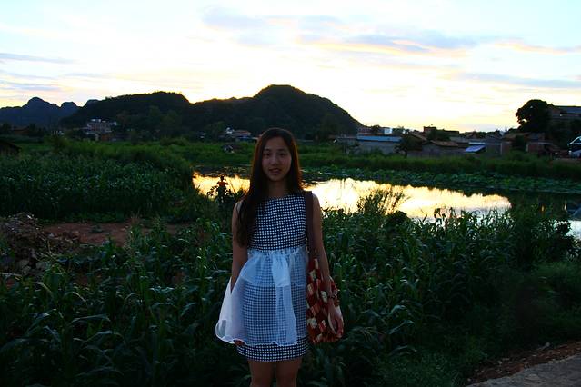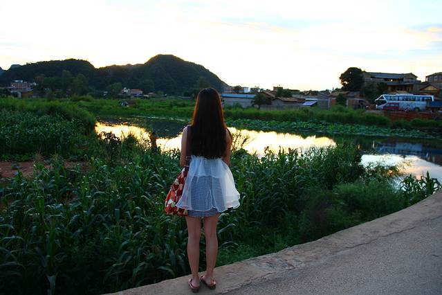 坐马车回到了普者黑村,第一天选择住在普者黑村周围,住宿的地方楼下就有餐厅,吃过了当地的美食,选择晚上去普者黑村再转悠转悠,试图寻找另外几个白天没找到的“爸爸去哪儿房”。正好巧遇夕阳。