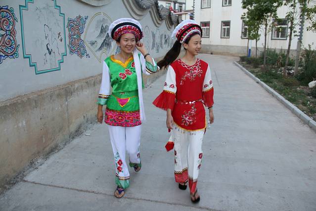 居住在同学家的白族村落,路边都是壁画,穿上了同学的白族服饰,戴着名为“风花雪月”的帽子,前往洱海边。