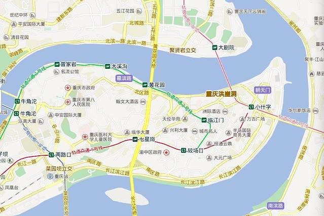 推荐坐轻轨,重庆特殊的山城地形,孕育出了山水之城特有的交通工具,一边是陡峭的崖壁,一边是城市灯火与嘉陵江水的交映,轻轨就架在之间任性的呼啸而过。以下是百度地图搜索提供的路线。