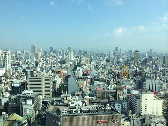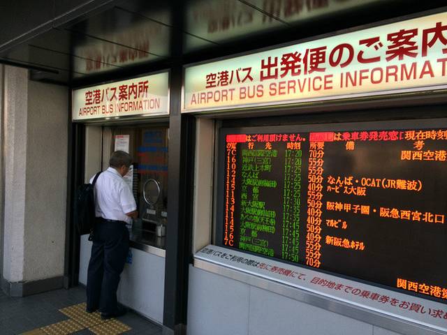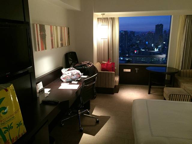 吃了饭,我们拿着外卖的包子坐上了去酒店的巴士。机场到达大厅出门以后就有卖巴士票的,我们这次定的是瑞士南海大阪酒店,坐去难波的巴士就可以直达,价格600多日元。到了难波的巴士站稍微有点转向,旁边的建筑太高分不清方向。其实下车背对汽车向左走,穿过马路再向右走30米就到了,直接上到6层的lobby登记入住。