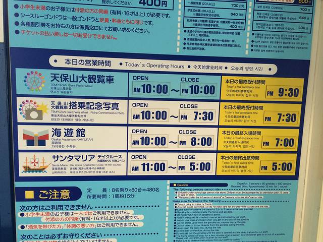 去年来大阪就做了短暂的停留,去了通天阁、大阪城和梅田空中展望台。逛了心斋桥、道顿堀,吃了道乐蟹。这次计划把其他一些感兴趣的再走一走。所以今天计划的区域是大阪港地区,有三个项目可以玩,摩天轮、海盗船和海游馆。