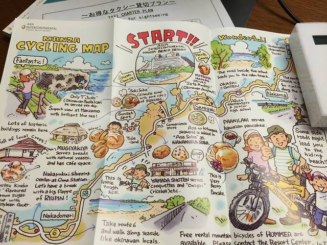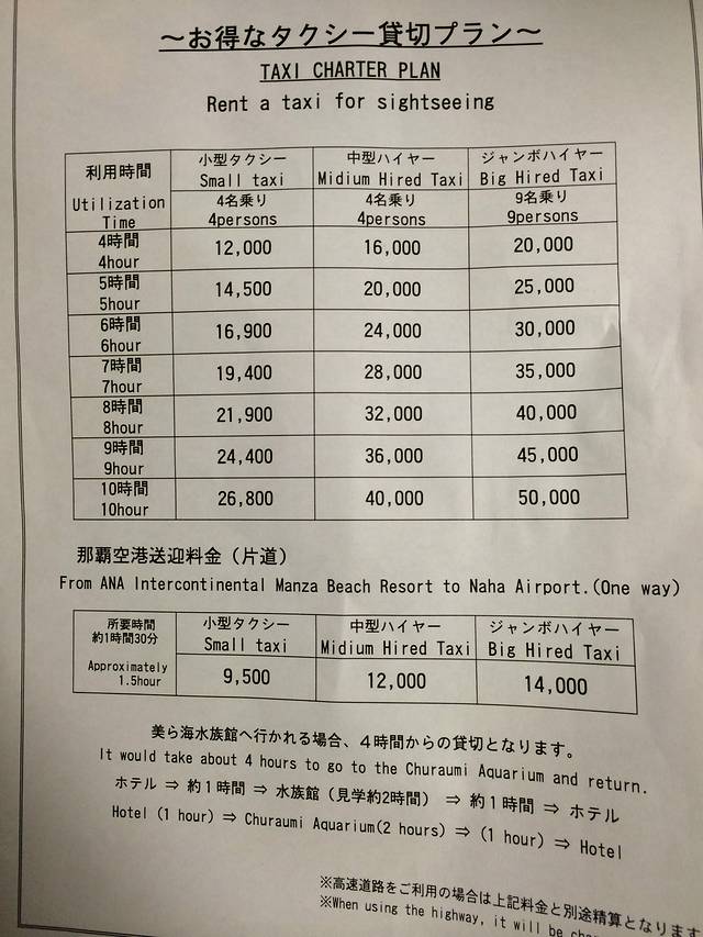今天天气很好,大太阳!计划是中部的观光游。冲绳的交通不是很便利,而且岛其实也挺大的,景点也分散,所以自由行包车比较方便,但价格不便宜。之前也在网上查过冲绳包车的费用,看攻略上有人直接在酒店叫的taxi把车,所以我也就没在淘宝上订。发现比淘宝的那些还便宜似的~这个还能分小时租,划算些~幸好没在淘宝上订~另外,酒店还免费租自行车可以骑~~