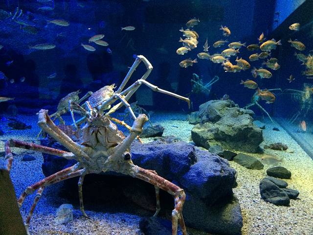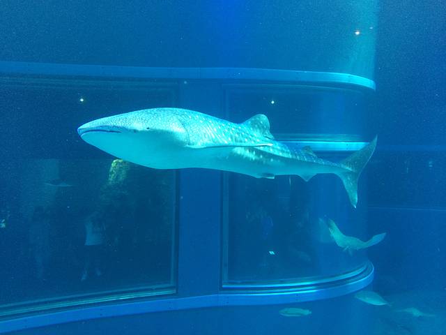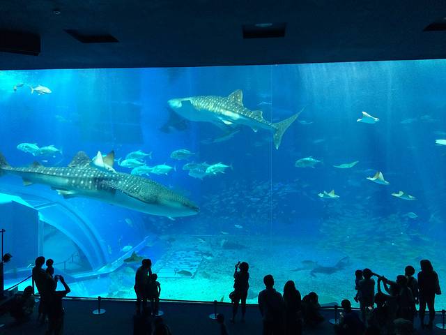冲绳这个水族馆没有新加坡圣淘沙的那个大,那个好像是世界第一大吧。但是这里的水箱里有三条鲸鲨,比较赞,水族馆出来的礼品店也没有新加坡的大,东西也一般。新加坡那个去了让我被消费了不少银子,这次就买了几根笔。海豚表演也不错,表演定点才有,最好不要下午2点以后去,因为有可能是逆光的。
