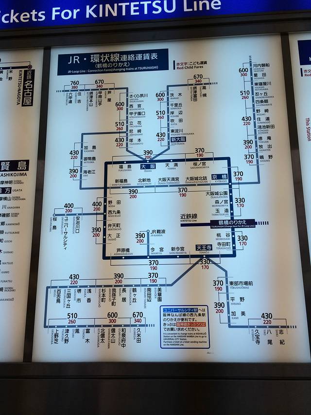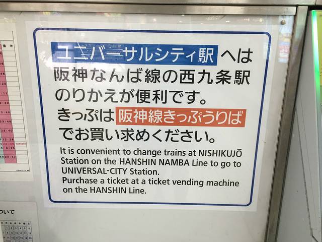 日本地下铁和电车的标示都很清楚,所以想去什么地方跟着路标走就对了。在JR难波站(阪神线也在这里)看到一个告示,告诉大家,其实要去环球影城最好先做阪神线到西九条,之后再换车去环球影城。这样比较方便。所以我们第二天也就这么走的。