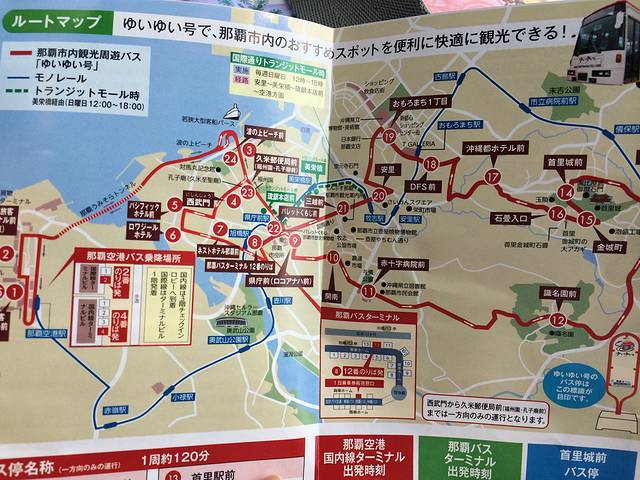 今天是坐观光巴士扫景点~那霸观光巴士yuiyui号的乘车点就在巴士总站,所以下楼就是。这个巴士不同于欧洲的那种,就是普通的巴士车,不是敞篷的那种。直接在酒店楼下的巴士总站买票,12站台上车~一日票价660日元,单次是230日元。