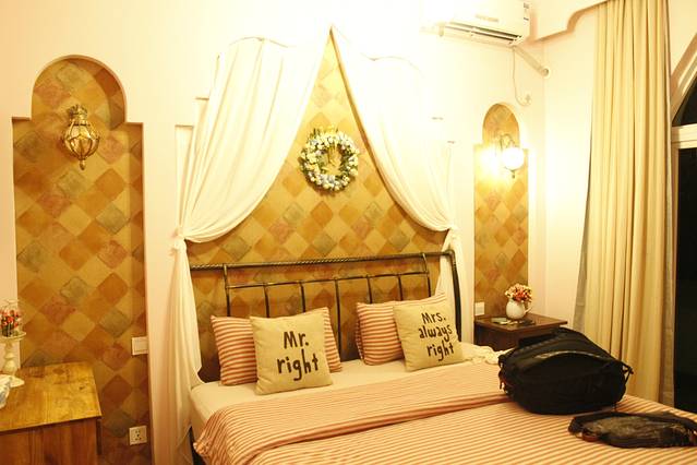 定的是达拉然的光大床房(一开始奇怪房间的名字都这么长,老公说因为是魔兽游戏里面的,我们才感叹店主的用心),我们是3楼,房间带一个阳台,阳台上放了小桌子和两个椅子,很艺术的白色,适合看着景色喝个咖啡什么的。只可惜外面没有什么景色,都是一些低矮的平房屋顶。
