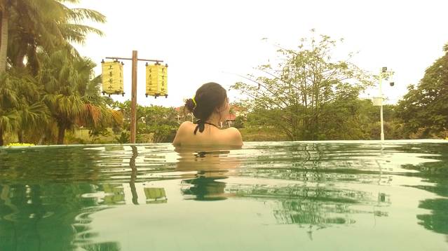 假日酒店的优势应该是它的泳池了,假日就一个大泳池,其他小泳池应该只是观赏用的,不能游泳比较浅。假日酒店的大泳池是无边泳池,无边的那侧是长方形的,而且比较深,游过去趴在泳池边看海真的很美哒!泳池也是分开深水区和浅水区,泳池地砖颜色不同用于区分。这个泳池白天晚上人都挺多的,尤其是浅水区的小朋友比较多。其中,还有很多来泳池边拍写真的。