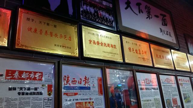 说一下大雁塔广场,这个广场很多饭店和买小纪念品的店(虽然不是很便宜,但是已经比景点便宜很多,而且质量基本是一样的。当时没有买,后来到了景点一看价格,那个后悔啊!),看了网上的额推荐,我们选择了魏家凉皮和天下第一面,天下第一面在广场最边上,门头很大比较好找。