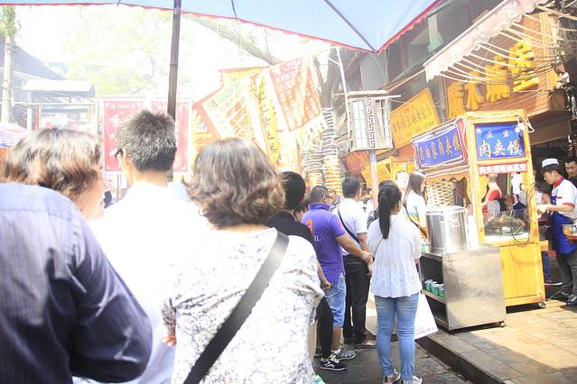 老白家肉夹馍,排队人很多,大概是因为这是一进北院门第一家大门头卖肉夹馍的,不明所以的游客都在这里开始排队。