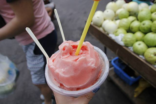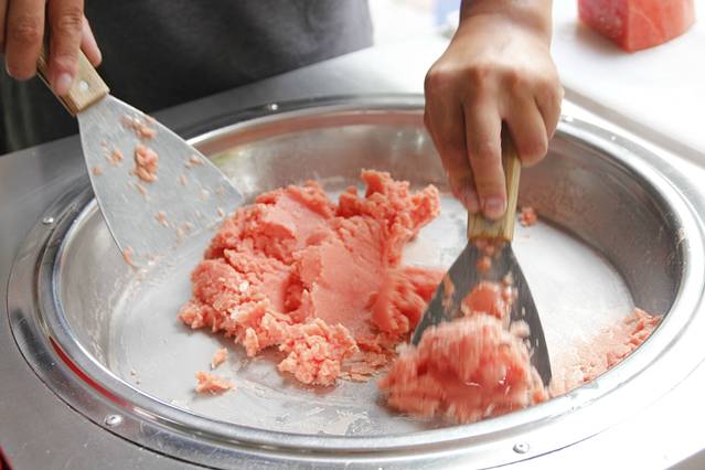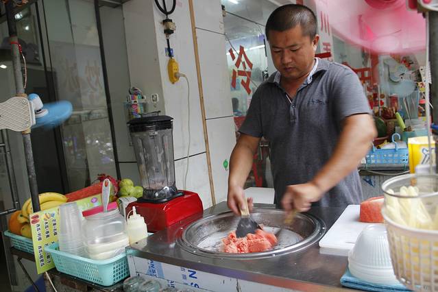 从市场出来,我们又走到小海螺海鲜加工店门口的摊买了一份西瓜炒冰,15元。这里要好好说说这个炒冰,实在是太大份了,而且化的挺快,我和老公着急忙活的才吃完。一开始是老板娘切得水果帮我们打了西瓜汁,老板才出来炒冰,一开始就是西瓜汁喝一点点鲜牛奶,一会儿再炒冰的铁板上就变成了粉色的西瓜炒冰,颜色超级可爱的!不过还是觉得芒果炒冰更好吃,而且化的没有那么快。这家的炒冰分量很足也好吃,老板娘态度很好,我和老公后来吃过别家包括希尔顿自助里面的炒冰,都没有这家好吃。