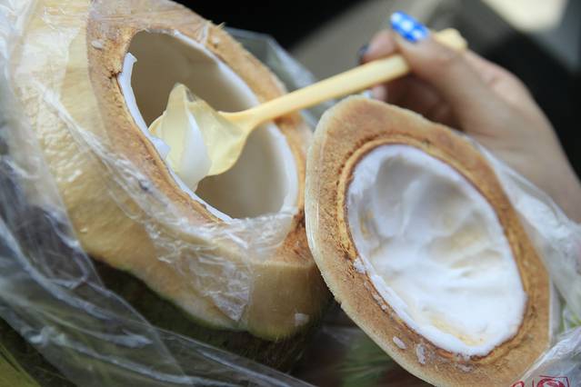 在三亚发现一个秘密,哈哈,白天在路边买的椰子都味道一般,有一天晚上我和老公沿着陵水酸粉这条街新风街往酒店走,路边有很多做在塑料桌椅上聊天喝椰子汁的三亚本地人,我和老公好奇过去问怎么这么多人,老板说这是海南当地人的生活习惯,我们便在他们家买了椰子,打开一喝,汁水超级饱满,也很甜,这些天白天买了这么多次都没有这么好喝的,特别新鲜,我们喝完老板说给我们打开让我们吃椰肉,真的超级棒,椰肉滑滑的很嫩。老板说还有一种老一点椰子,那种椰肉有点脆的口感也很好,我们就又买了一个,也很好吃!