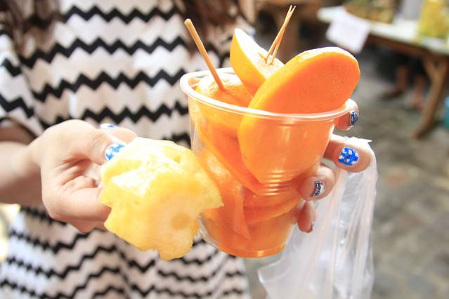 在第一次去三亚买过的水果摊买的水果:青芒6元一斤,释迦24一斤,榴莲肉一块10元,我们买了大约90多元的水果,直到我们离开三亚也没有吃完,最后有一些熟透的都开始坏了,我们就没有带走。