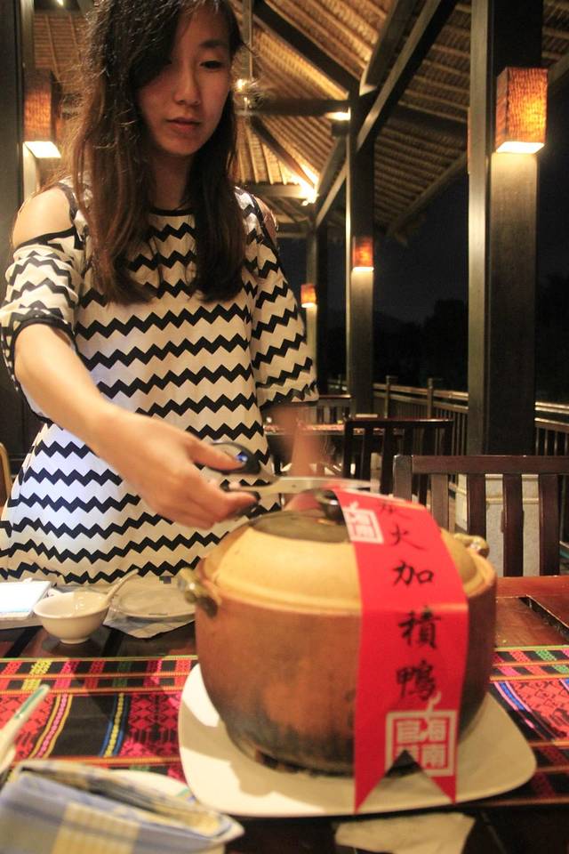快9点才到餐厅,餐厅的厨师说是9点下班,我们匆忙点了海南特色菜:炭火加积鸭煲和干煸东山羊。