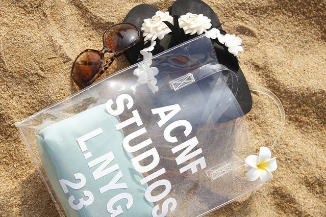 三亚沙滩必备装:拖鞋、墨镜和沙滩包,沙滩包里面是防晒霜、手机、湿巾和房卡