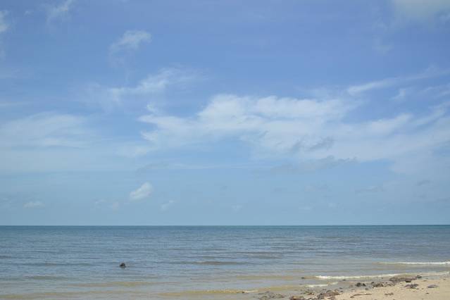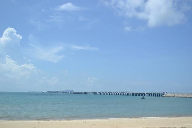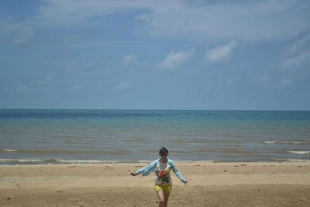 沙滩较为普通,没什么特别之处。百度介绍:沙滩的沙子很漂亮很松软,在阳光的照射下很白,刺得人睁不开眼晴。天空与白云、海水与浪花、沙滩与茅草棚、渔船与远处的风景、很自然地构成一幅极美的风景。