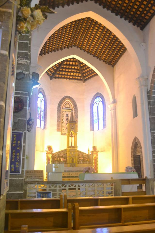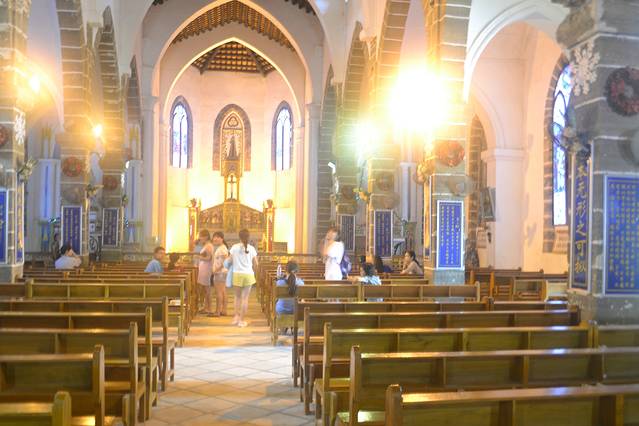 涠洲岛天主教堂位于涠洲岛盛塘村的天主教堂,掩映在一片绿影婆娑的芭蕉林和菠萝蜜树林中,是清末“雷廉”地区一座最为宏伟的教堂。该教堂由法国巴黎外方传教会传教士修建,落成于1880年。该教堂为哥特式建筑,楼高21米,总建筑面积774平方米,连同附属建筑在内总面积达到2000余平方米,是广西沿海地区最大的天主教教堂,2001年被列为全国文物保护单位。