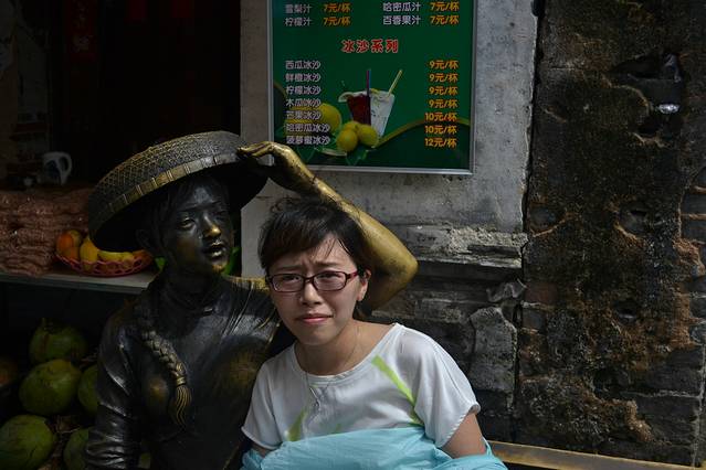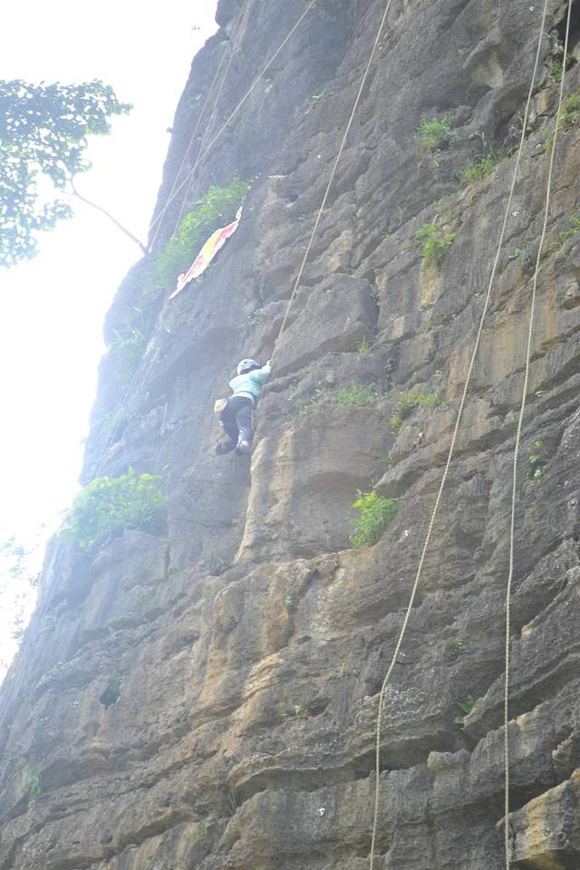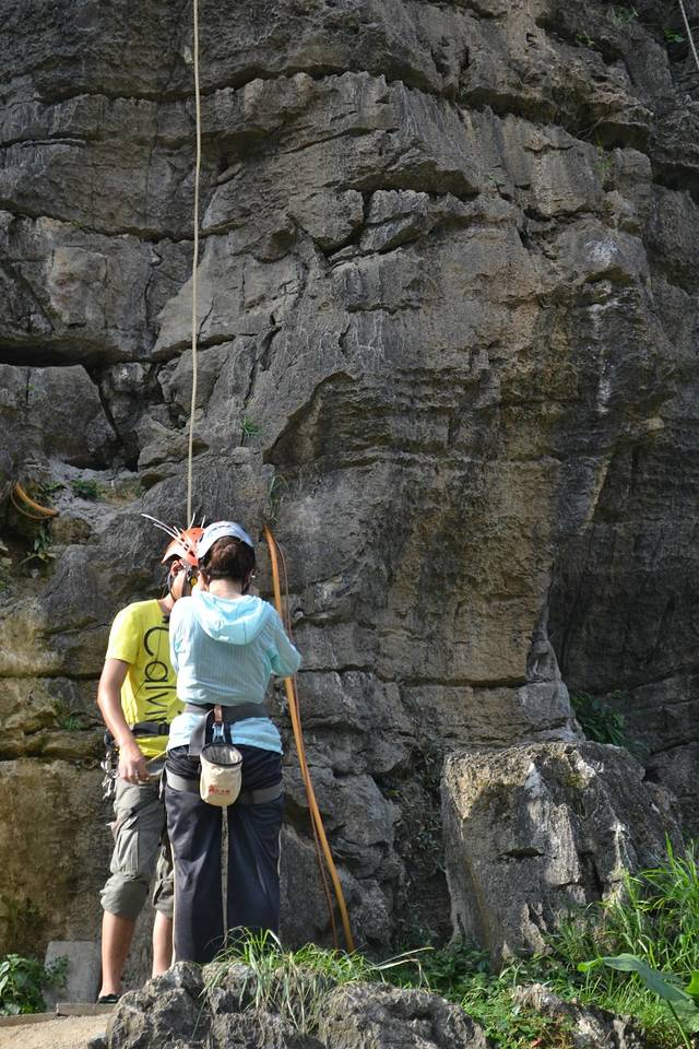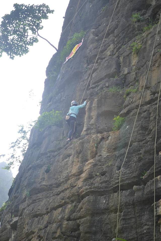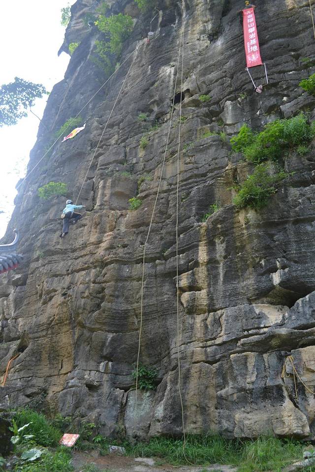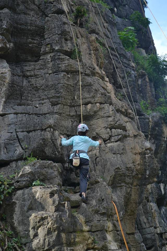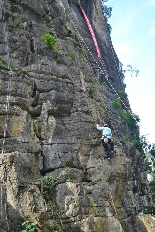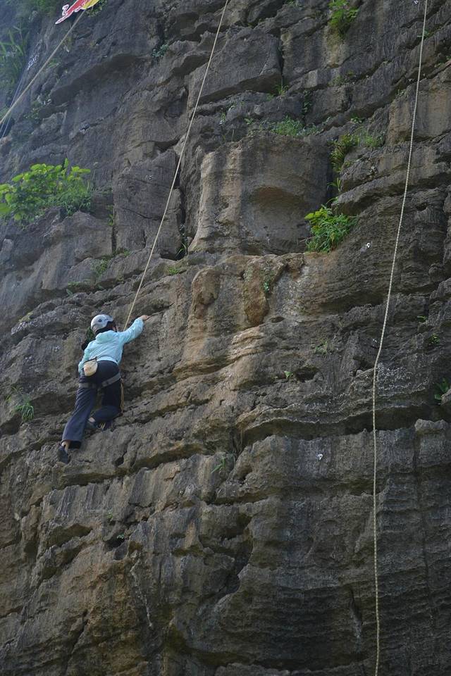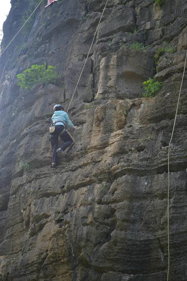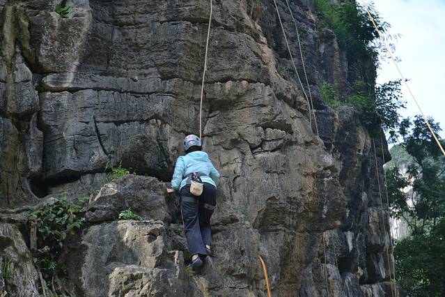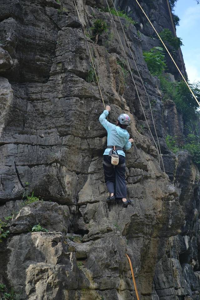 在骑行十里画廊路上,远远遇见路边有一群人围观,上前一看,攀岩。老婆跃跃欲试,想做一会女汉子,准了她。经过教练简单的介绍,安全绳、头盔、鞋子穿戴整齐,朝着最高目标前进。费用100元。下面多上点照片,以充分展现我家女汉子的威武。在她登顶敲锣的一瞬间,不光是在场的游客爆发出热烈的欢呼声,其实我也被深深震撼,老婆好样的。