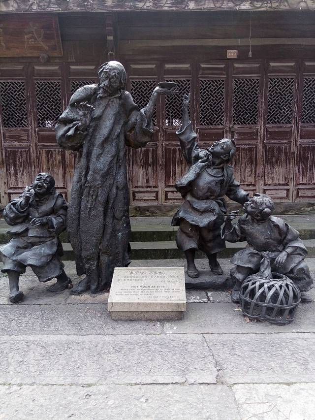 走过柯岩,游过鉴湖,在坐着船到了乌镇,真有点像鲁迅笔下所说的摇着船到外婆家看社戏的感觉。这里是根据鲁迅的小说写的场景还原的,大概是因为这样,所以有些都是禁闭关门的,游客以及居住的人不是很多,显得很空,不过也算是很好的还原绍兴古镇,水乡的原貌了。有一条商业街卖绍兴特产的,也就是黄酒,茴香豆,芡实糕之类的。鲁镇主要景点有鲁府,陈半丁纪念馆之类的。