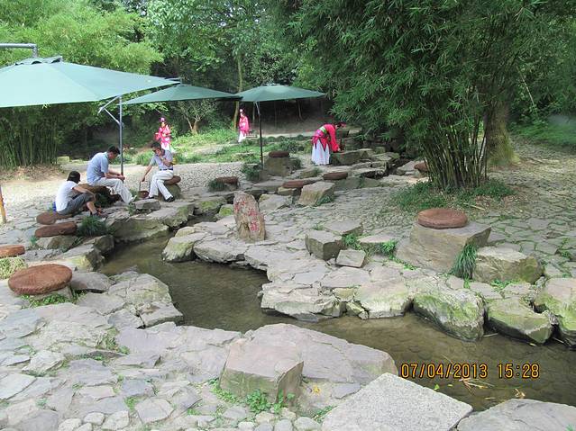 曲水流觞。这里定期每年在清明节举办书法大会,仿效古人曲水流觞雅事。