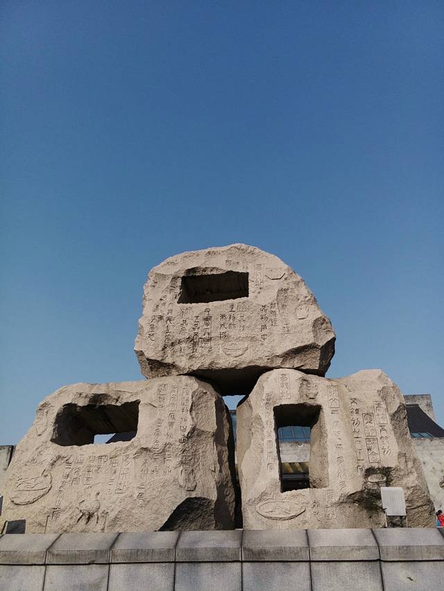 中国黄酒博物馆外面的三块大石头,上面刻的文字有关酒文化的。里面分为酒史厅、酒艺厅、影视厅等。