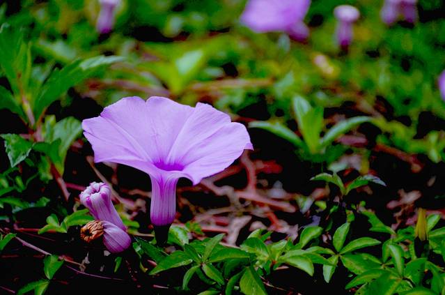 有的含苞待放,有的亭亭玉立。摄影大师们站成一排,相机都对着这些羞涩的野生紫色牵牛花。所有人都争先恐后的捕捉这充满野趣的一幕