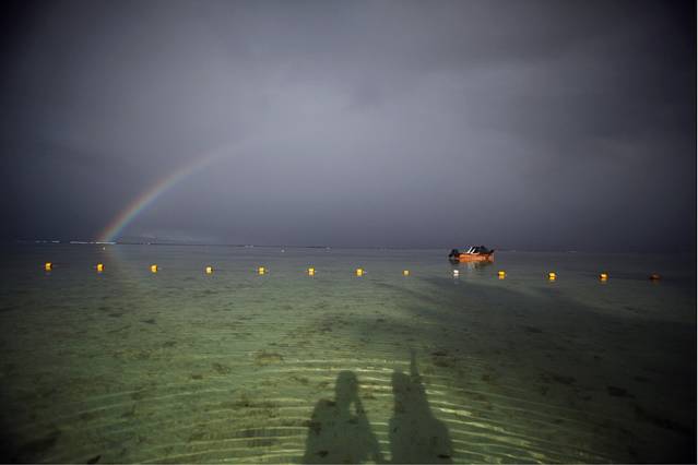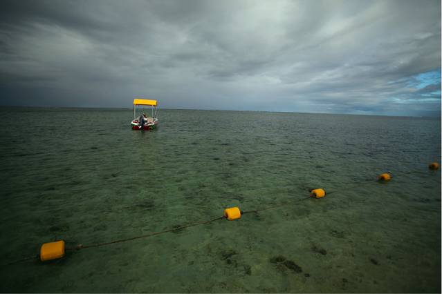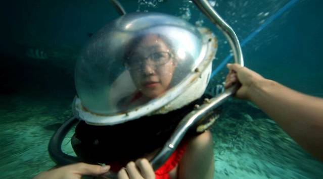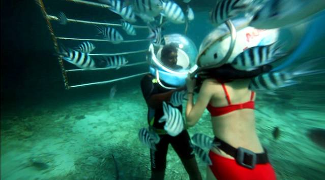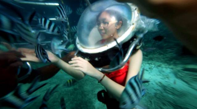 这之后就要出发去海底漫步了,之前对海底漫步还是很期待的,幻想的是那种两个人带上氧气面罩然后在一堆热带鱼的陪伴下手拉着手在海底瞎溜达,此情此景是有多浪漫啊,下水之后就知道自己是在做梦了。我们再次坐快艇到了另一块海中间的平台上,这是专门进行海底漫步的地方,30美元一人,和在海南潜水时一样系上了很重的腰带,穿上潜水鞋,听教练简单讲解手势和注意事项之后就开始下水了,沿着一个梯子下到海里,在头就要到水面的时候工作人员会给你扣上一个带管子的氧气面罩,那个面罩真的不是一般的重啊,就算是到了水里,有了浮力,我仍然被它压的吃不消,完全无法保持平衡,拼命用手往上抬着,耳朵也特别的难受,脑袋完全丧失思考能力,只能靠工作人员拉着我向前走一步我就走一步。真的不知道常听说的那些水下求婚之类的是怎么完成的。