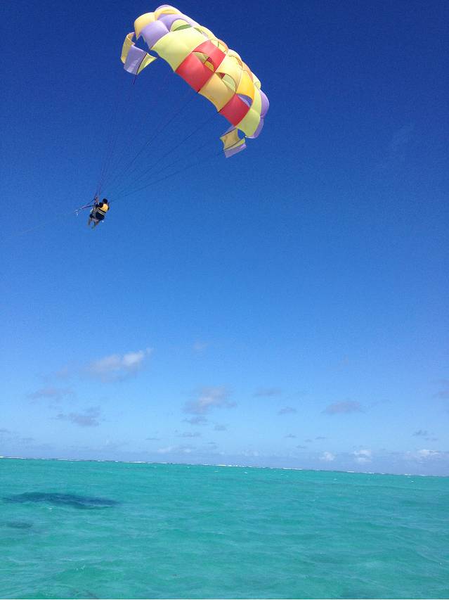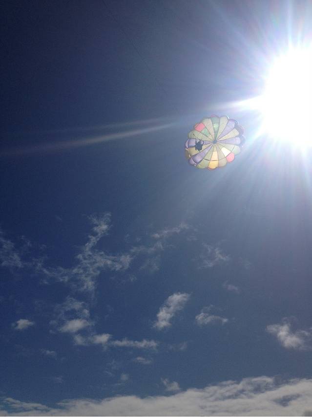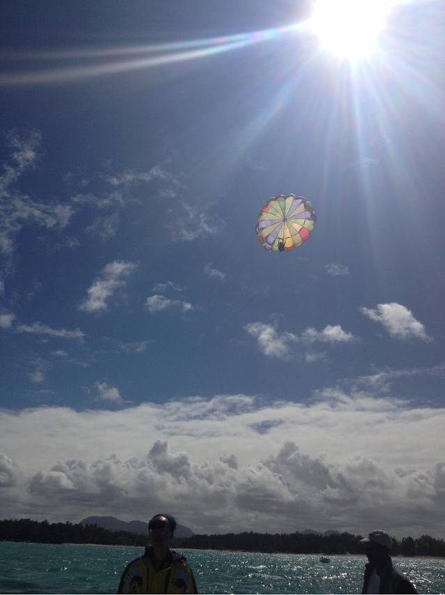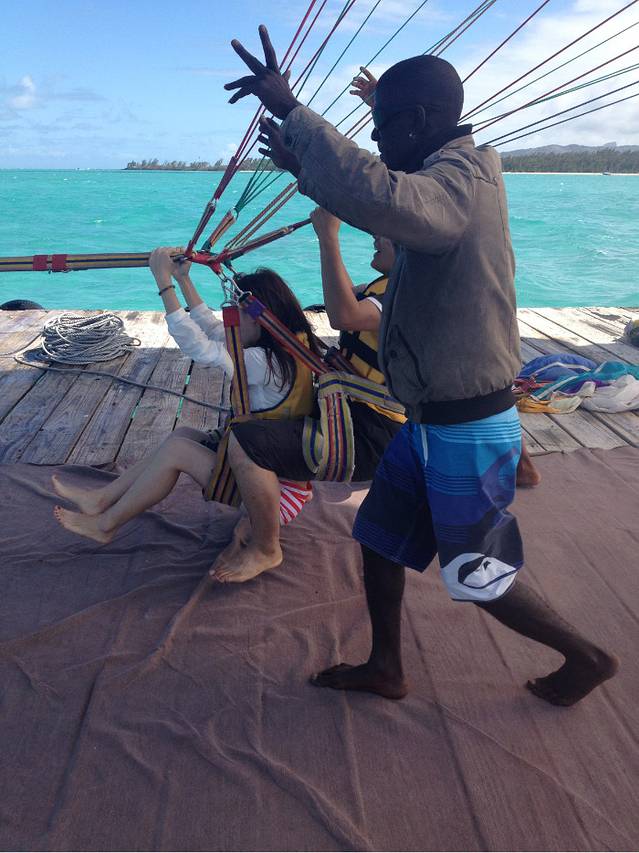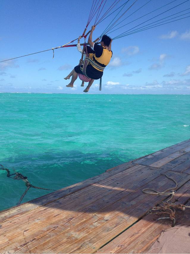终于要到我们了,C同学不听劝阻非要把相机带上去,要在前面拍,但是沟通之后才知道一定要力气大的男生在后面才行,后面那个人是控制方向的,我这种是肯定抓不住绳子的,所以最后还是我挎着相机在前面,C同学断后。我们抱着一旦降落时落在海里就只能把无敌兔海葬了的念头准备“起飞”了。
