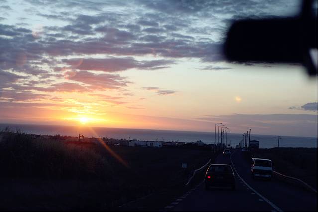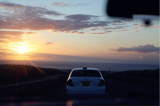 一日游圆满结束,回酒店的路上太阳已经开始要落山了,我们心里好着急希望回到海边的时候能拍到落日,但是看这趋势是不可能了,C同学很郁闷,我一旁安慰着说还有好多天迟早会拍到的,他就开始教训我说“你不懂有些光线就是要抓住时机,不要想着还会再有,很可能再也没有遇到了”,果然如此,那之后我们再也没有遇上这样的落日,说要抓住时机的C同学以身作则在车上用相机记录了日落时分。