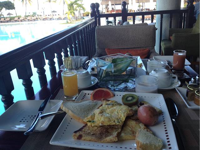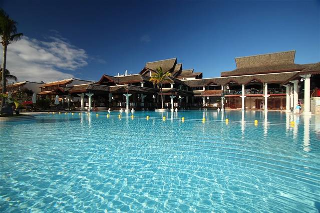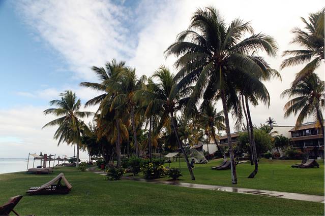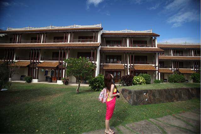 言归正传了,因为在毛球期间参加了两次一日游,跟同行的游伴们了解到了很多其他酒店的情况,虽然不够全面但是也还是有一些价值,正在为选酒店犯愁的同学们可以参考一下。我和Charles同学住在西南海豚湾处的索菲特酒店,选择这个酒店真的不是因为它有多好而是因为我们报名太晚了,这是不得已的选择,结果对比之后发现这个酒店还是有很大的优势的。首先那些顶级的五星酒店我是真的不了解情况,排除掉这些酒店之后剩下的不错的大家去的比较多的五星级酒店大概就是西海岸的希尔顿,爱必浓,索菲特以及东海岸的贝勒玛尔。希尔顿和索菲特两个酒店都在海豚湾,仅一墙之隔,酒店的私家沙滩也是相连的,甚至连酒店布局、建筑风格都有几分相似,并且同样都是提供早晚两顿自助餐(晚餐不免费提供酒水,所有的饮品都要自费),但是Hilton的无线网不是免费的一天大概一两百的价钱(当然也可以选择走几步路来索菲特蹭无线网),这不是关键,关键是Hilton的人可真是多啊,沙滩上晒太阳的人口密度比索菲特多了三倍还不止,所以在报价基本一致的情况下建议大家还是选择索菲特吧。贴一张Charles拍的索菲特酒店主楼和游泳池的照片(请注意真的是没什么人啊):