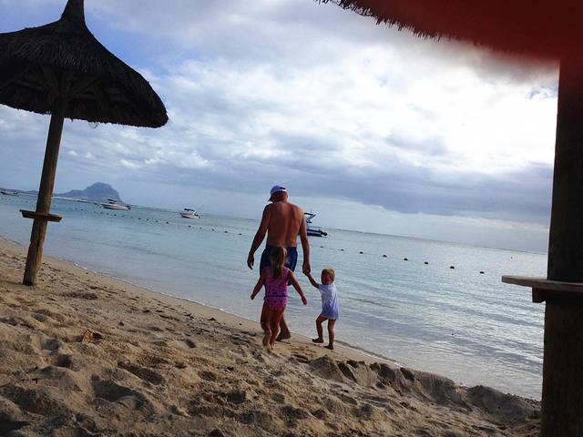 好不容易打发走了当地的小商贩,突然在沙滩上看到很有爱的一幕,一位称职的爸爸很有耐心的带着两个超可爱的小baby一路走一路捡贝壳。