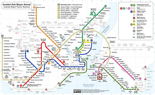地铁---伊斯坦布尔的地铁还是比较发达的,在欧洲机场有M1地铁直通老城区Aksaray站,如果要到蓝色清真寺那块还需要换乘T1线,需要注意Aksaray站换乘T1时要走一段路,虽然地铁图上是标在一起的,但要走四五分钟,票不能联用,需要出站单独再购票,如果不买公交卡单买票的话不管里程都是4TL,买公交卡充值的话能优惠很多。伊斯坦布尔地铁不像我们国内地铁需要刷卡进出,他们只需要刷卡进,出来不需要再刷卡,买投币的机器在每个地铁站旁边都有,都设计的比较少,机器支持5、10、20TL的纸币购买,当然也支持硬币,机器统一收4TL,投入按个按钮就能购买,方法如我们国内贩卖饮料的自动机器。下面附上地铁图。