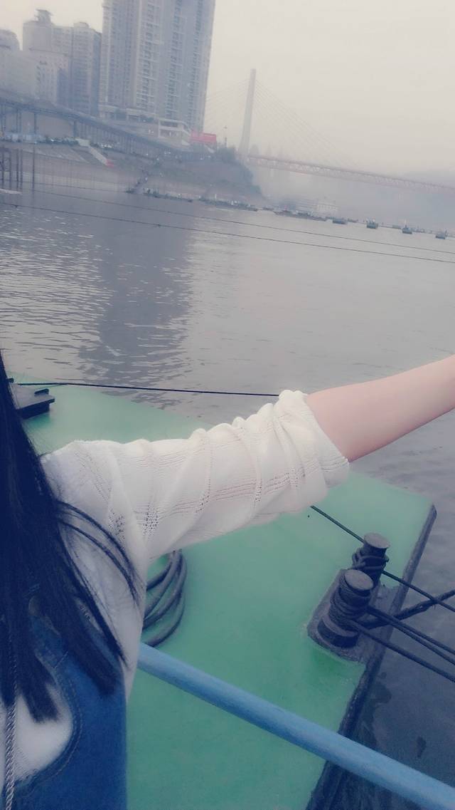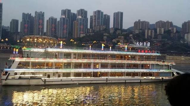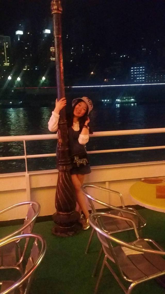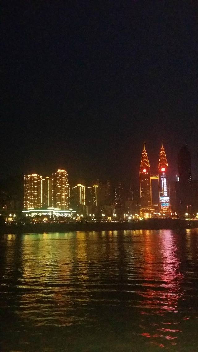 下午 5点半在解放碑附近吃完好多小吃后就去找了去江边的公交车,去的时候这个广场正在修,坐了公交车颠簸的一小会就到了江岸,遇到了人生中第一个票贩,男票机警地问了几次价格,最后看到一个阿姨,就她了。谈好了两个人120,去坐游船进行夜晚的两江游。这儿需要说明的是要提前上去早早占座,我们很幸运碰到了一对本地的情侣(我猜的),然后还很热情地邀请我们一起玩牌。我扑克牌堪称世界最烂啊。尤其是这种不熟悉的玩法。输了一路,最后船开了 看夜景吧!