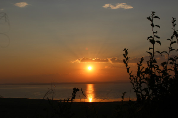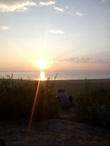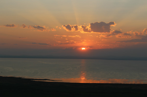 晚上7点10分左右,落日的帷幕渐渐的拉开,暗灰的天空里已经嵌上闪闪的小星星,绚丽的晚霞把草原映射出一片艳红,极尽绚丽之美,达里诺尔湖静谧的像襁褓中熟睡的婴儿,偶尔天空中飞翔的鸟儿将湖面荡起阵阵的涟漪,巨型的风车像钢铁怪兽一样发出呜咽的声音。“夕阳无限好,只是近黄昏”,但是夕阳的博大却远远胜过日出的瞬间。大自然鬼斧神工不过如此,凉凉的晚风袭来,让人略微有些寒颤,真被这美妙的景色所吸引,“落霞与孤鹜齐飞,秋水共长天一色”是最好的写照,最美不过夕阳红,这是这次旅行见到的最美丽的景色,“人生若只如初见,何事秋风悲画扇?”这美丽的景色,和夕阳下依偎着的背影,会镌刻在永恒的记忆中。