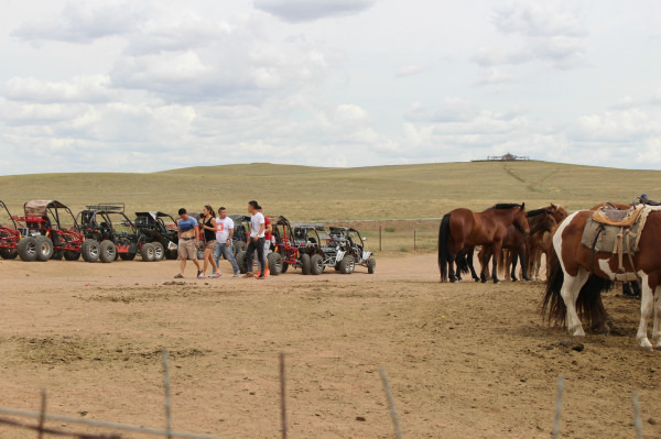 不过进入景区后,视线突然开阔。途径卡丁车游乐场,四个人租了两辆山地四轮摩托车,150每辆每小时,在草原丘陵上纵横驰骋,然后爬到丘陵顶上滑槽下来,很过瘾。经过红山军马场第三军马基地,有大量的马匹,不过恰逢周末,人也多,价钱也贵(100元每小时)。又开车二十分钟后,寻找到路边上一个牧民马场,进去后给我们算的60每小时,在空旷的草原上骑行一个小时,不过速度有点慢,没有跳骑马舞的感觉。