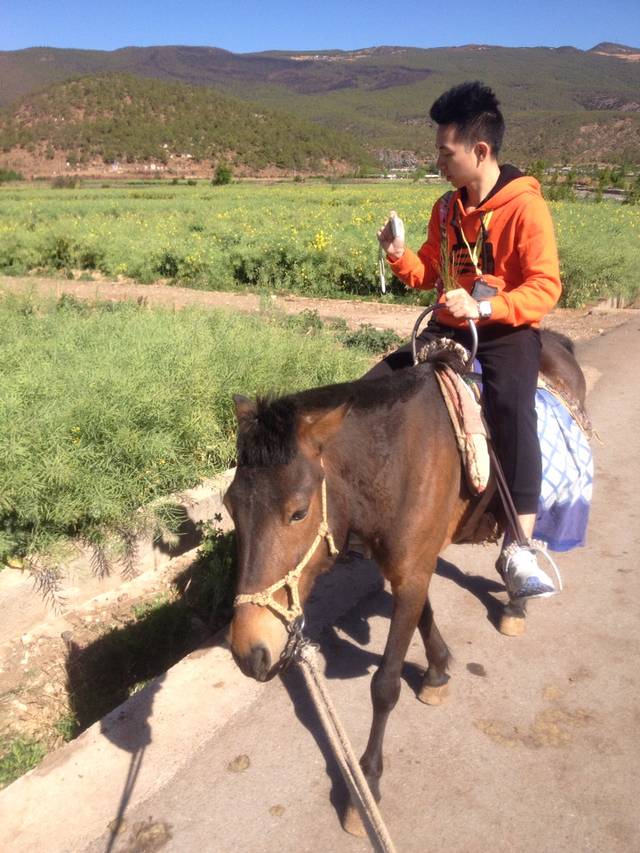 先去骑马,走了一小段茶马古道(就是一个小黄土坡)。这里的骑马不是自己能控制的,有专门的人带着马儿走。