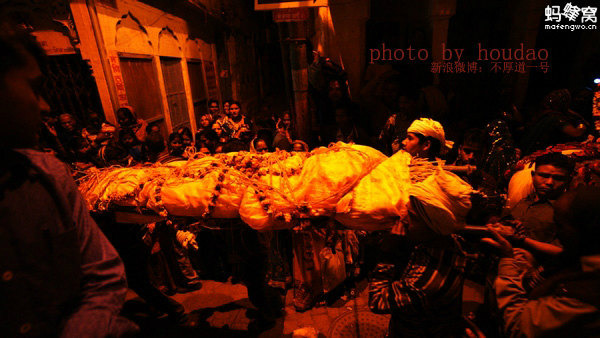 婚欢乐队伍与奔向天堂的平静队伍在一个狭窄的转角老城小巷里交际,生与死交集的瓦拉纳西,在一瞬间让我忽然明白轮回的精神内核,一队赶往幸福生活开始,新生命诞生的婚礼生的队伍与一队赶往天堂往生人世的队伍交集,生死轮回就在这样的午夜,这样的狭窄恒河边的瓦拉纳西小巷里轰然上演……