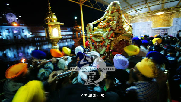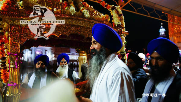 饰的黄金花轿的长老走出来。花轿上用鲜花密密麻麻地堆满,里面是供奉的是1604年写成锡克教经典《阿迪格兰特》。跟随的长老手拿拂尘边走边扫,一位手拿