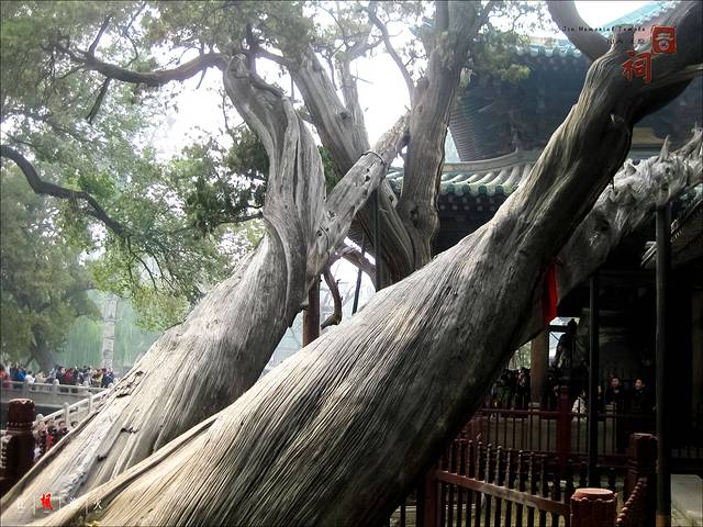 令人称奇的是,不知何年卧柏下面又长出一棵翠柏,大概是仰慕德高望重的先辈,义不容辞地撑住了倾斜的古柏,而且干杈交错是那样的自然天成,令游人赞叹不已。