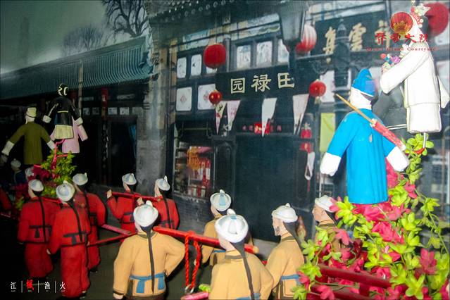 新娘入轿后,鼓乐齐鸣,在鸣锣开道声中,花轿开始启程,仪杖队进行在路上,据说是县太爷在路上遇上也得绕道而行,民间有句俗话“百日为民,一日为官”。正房展出的就是拜堂的情景,大家看到新郎戴着官帽,而新娘头上顶着盖头,那这个盖头是要用秤杆挑起来的,取意为称心如意。拜了天地就要如洞房了,我们来洞房看一看,炕上放着一个马鞍,新娘要用一只脚跨过去,这时全人把马鞍撤走,另一只脚就不跨了,意为“好马不配双鞍,好女不嫁二夫”,此外还有“新娘跨马鞍,一世报平安”之说。炕角分放四只萝卜娃娃,萝卜谐音摞辈之意,希望新媳妇过门后,能为主家传宗接代贡献力量。此外还有糖盒,里面有桂圆、莲子、花生、枣,有早生贵子的意思。晋中地区新郎,新娘入洞房后,马桶要由小姑提到洞房,她提着盆在门外喊,“姑姑提盆盆,嫂嫂开门门,侄男侄女一群群”讨其吉利,自然红包不能少。
