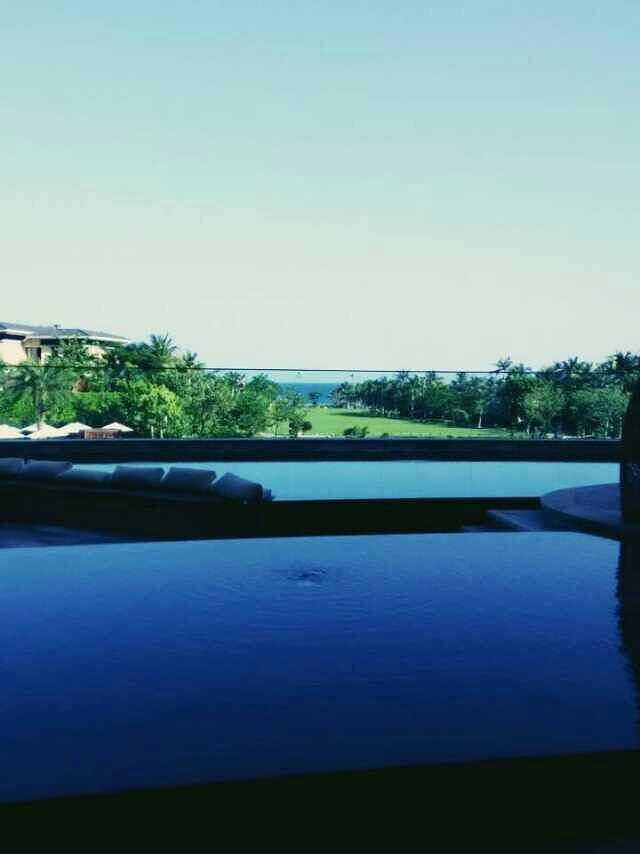 这是在天房洲际的酒店大堂拍下的,近处的人工水潭,再往下是超大泳池,还有那绿油油的草坪,还有那海天一线的海平面。当时就觉得三亚简直是太美了。太美了。