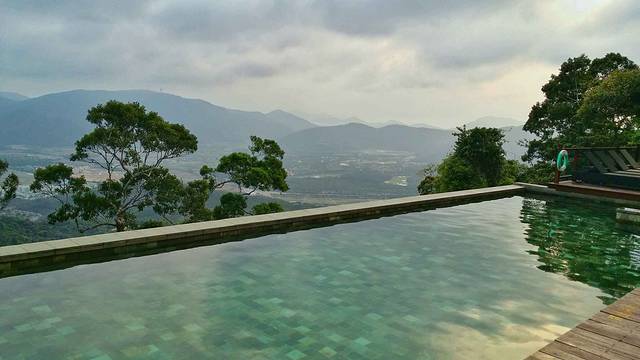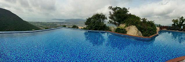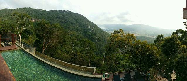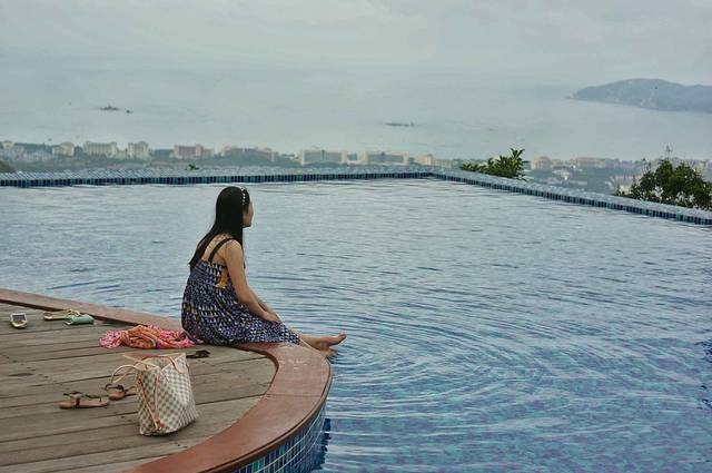到达天堂鸟巢已经是下午四点,经过一天的驾车,我们都疲惫不堪,但是当我们把车开入天堂鸟巢时,还是兴奋的惊呼。站在半山腰,吹着徐徐微风,眺望远方的亚龙湾,太舒服了。天堂鸟巢酒店分为几个区,每个区都有餐厅和游泳池,每个区看的景观都不一样,房间也各不相同。我们放好行李,就奔去游泳池了,落日的余晖映照在池边,我们夫妻俩包场游泳。酒店的游泳池感觉都很棒,其中西区的峭壁天池尤佳。建在悬崖峭壁上的泳池,远远看去和亚龙湾的海连为一体。