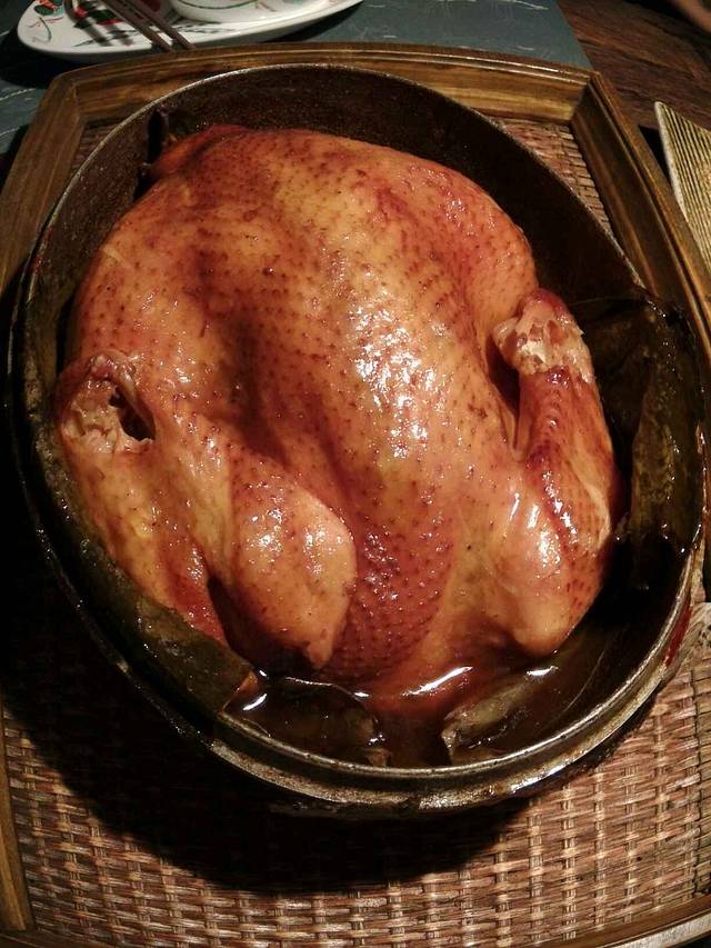 叫花鸡。厨师会让客人敲三下,然后说三句祝福的话