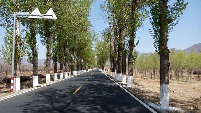 烈日下的林荫柏油路,宁静又凉爽,形成一道独特的风景线。